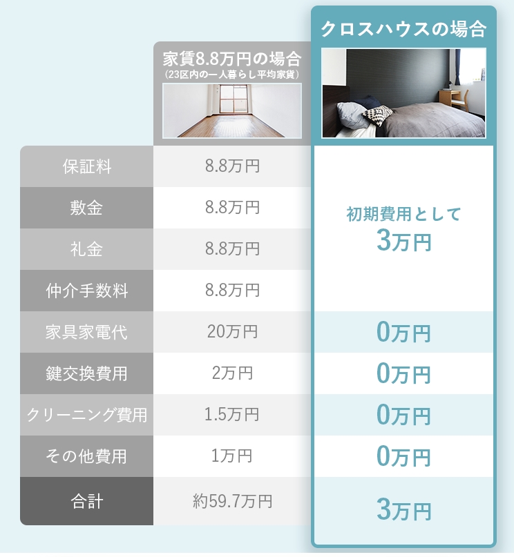 通常の賃貸契約では敷金・礼金・仲介手数料・前家賃などで数十万円必要です。しかしシェアドアパートメントでは、初期費用は3万円のみ。さらに期間限定キャンペーン中は完全無料で入居できる場合もあります。